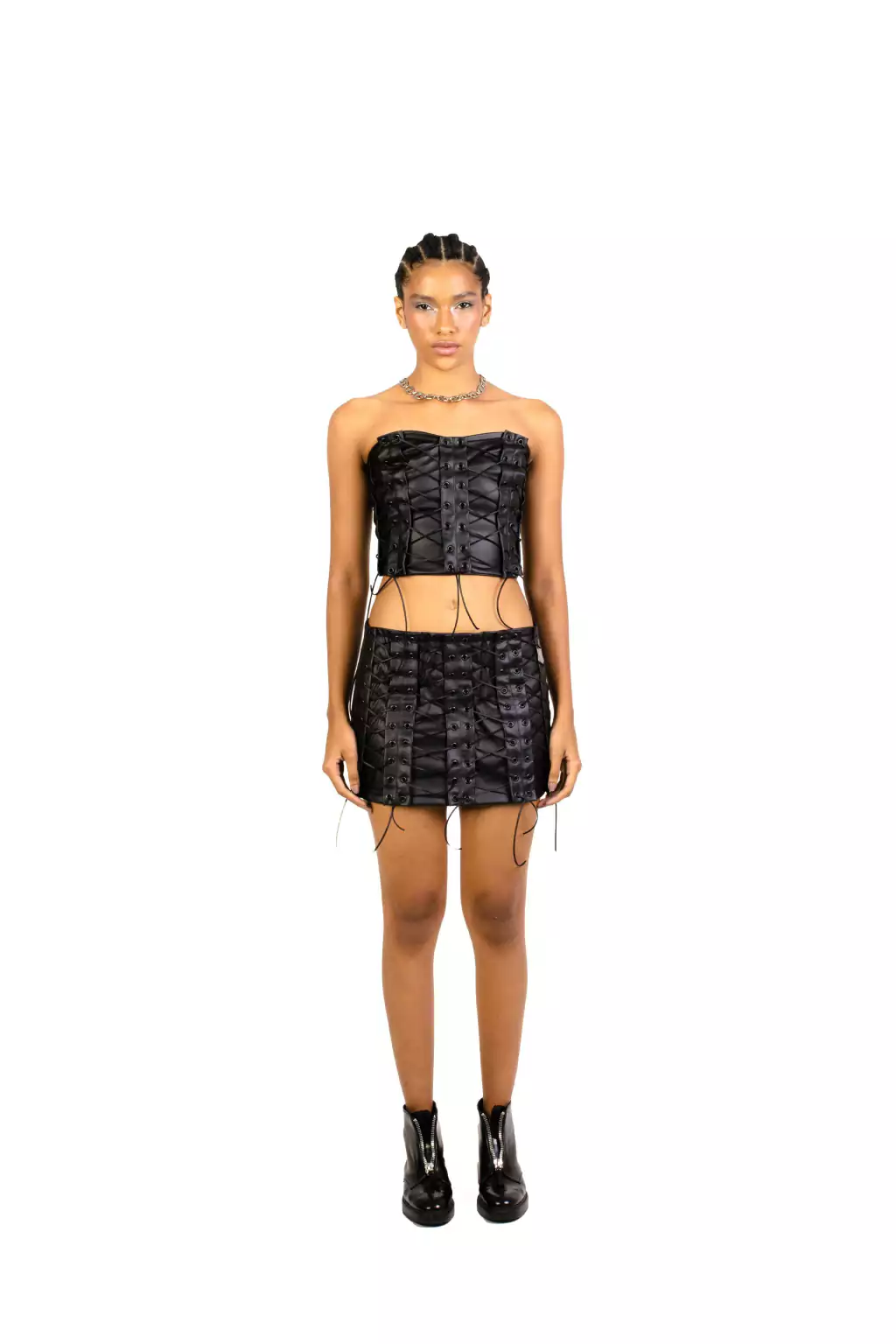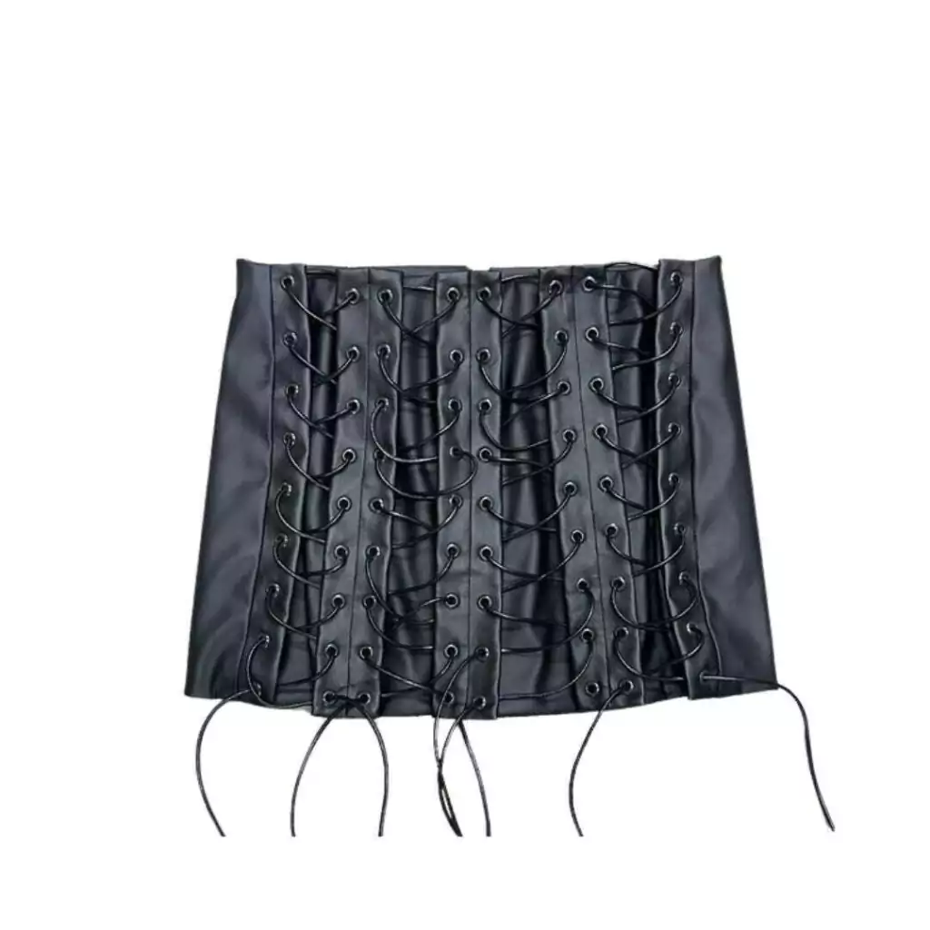 A nossa mini saia " Love affair " é muito especial. E trouxemos ela agora em outro tecido e na cor preta. Ela foi fabricado em um tecido de couro ecológico , 100% poliéster, e possui 80 ilhós pregados a mão. O seu fechamento é através de zíper invisível nas costas .